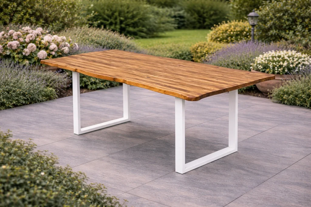 Masif Ahşap Tabla: Masa tablası 30 mm kalınlığında gerçek masif ağaçtan üretilmiştir ve UV mat vernik kaplama ile dış etkenlere karşı korunmuştur.