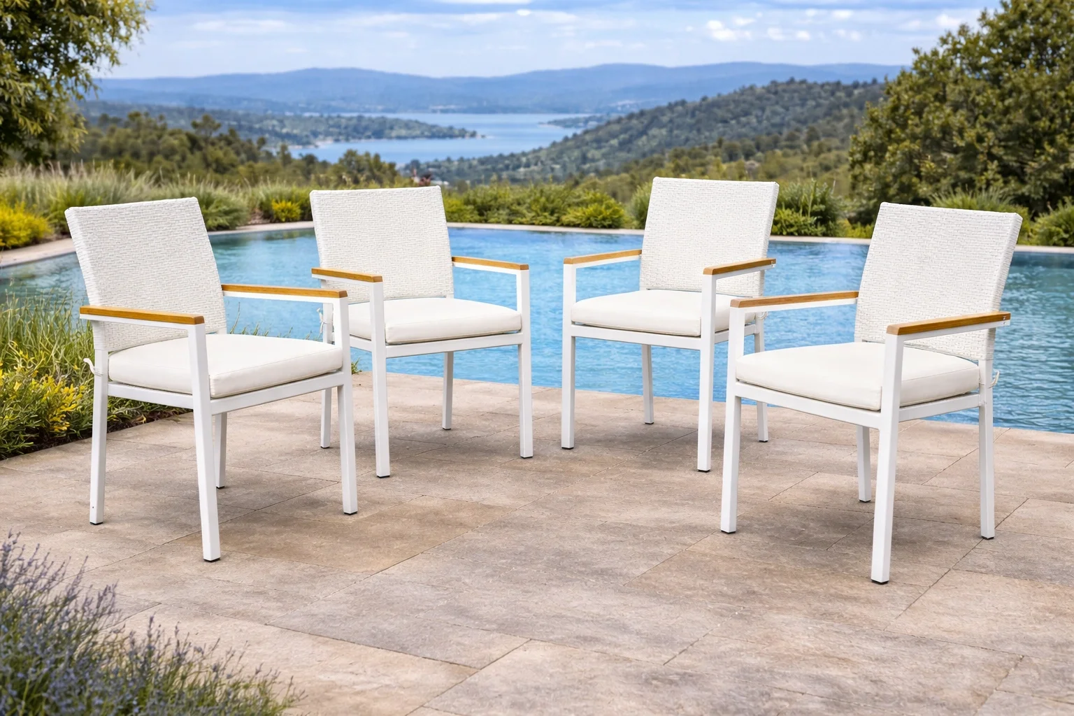 Özgün Sandalye Tasarımı: Beyaz örgü dokulu sandalyeler, kolçaklardaki doğal ahşap detaylarla bütünlük sağlar.