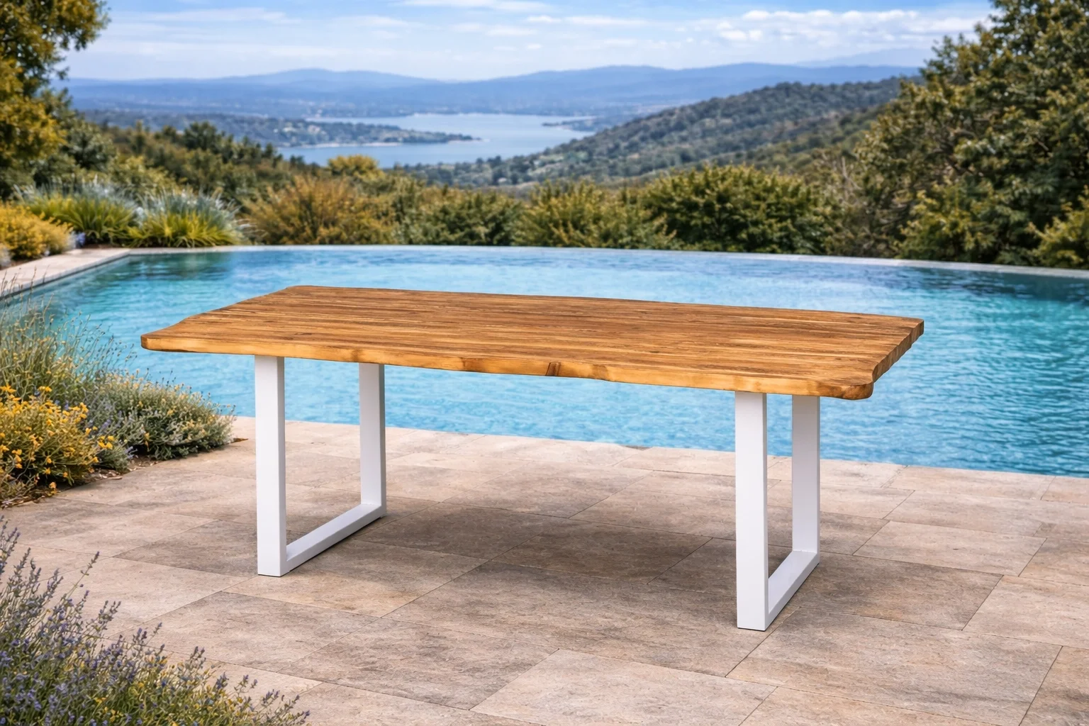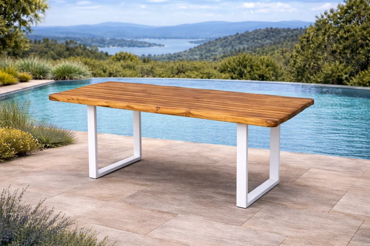 Masif Ahşap Tabla: 30 mm kalınlığında %100 doğal masif ağaçtan üretilen tabla, UV mat vernik kaplaması sayesinde dış etkenlere karşı dayanıklıdır.