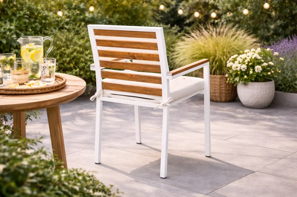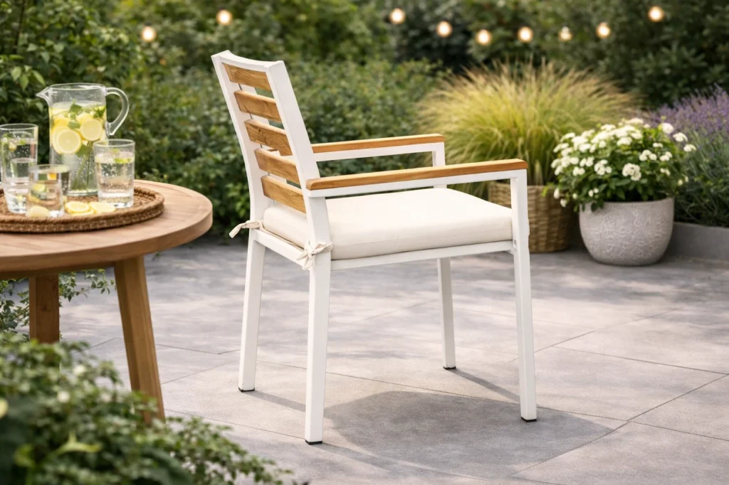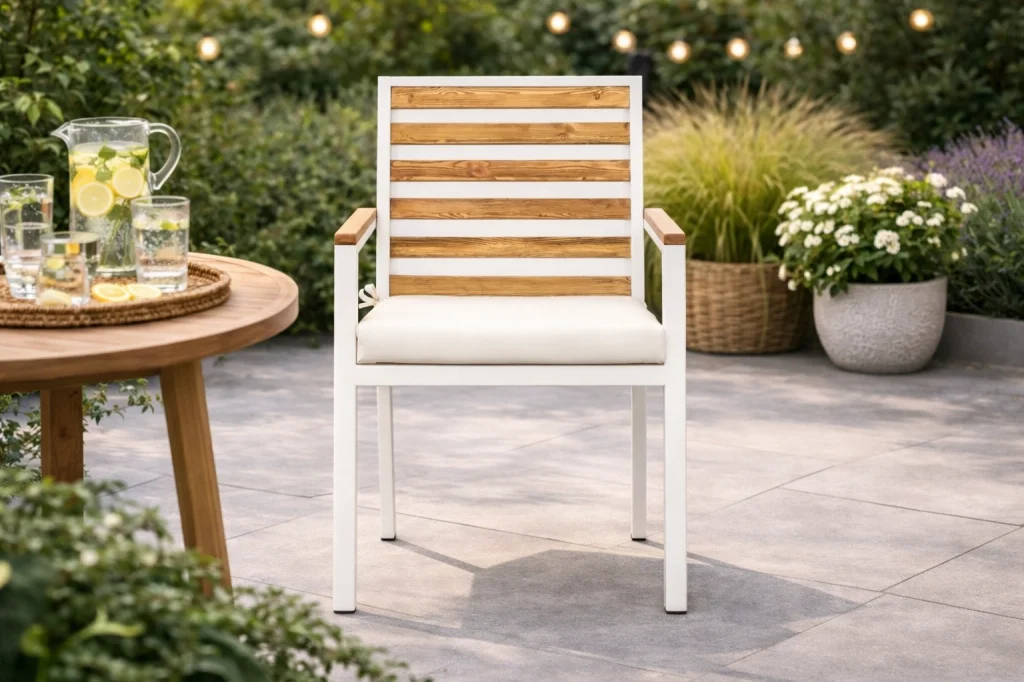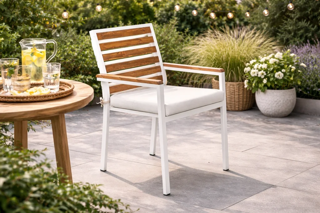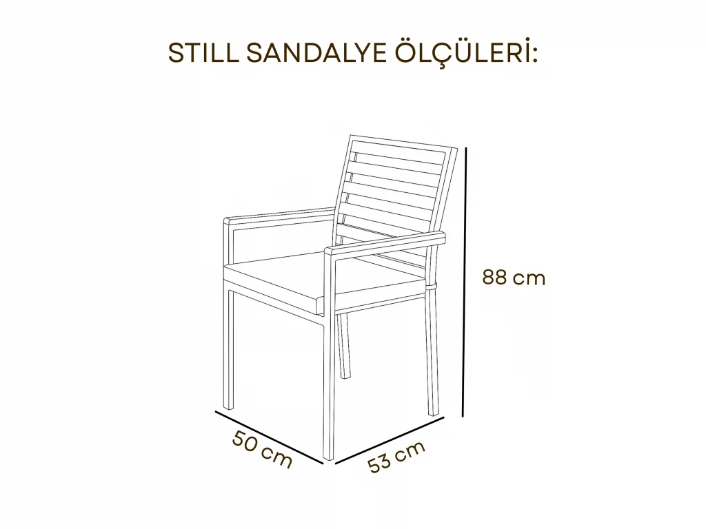 Doğal ahşap ve sağlam beyaz metalin uyumlu birlikteliğini yansıtan Still Sandalye, sade çizgileri ve dayanıklı yapısıyla balkon ve teraslarınıza fonksiyonel bir şıklık sunar. Gövdesi yüksek kaliteli beyaz metal malzemeden üretilmiş olup, uzun ömürlü kullanım için sağlam ve dengeli bir yapı sunar.