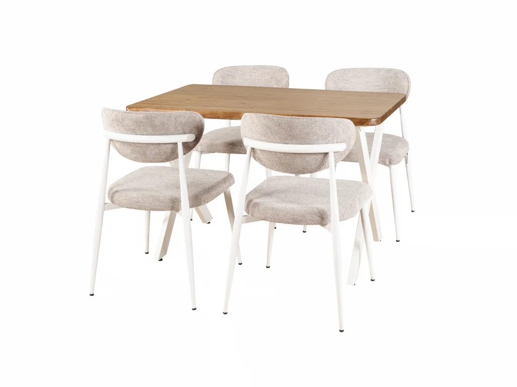 Noxis Sandalyeler (4 Adet): Yumuşak döşemeli, vücut ergonomisine uyumlu sırt desteği ve şık beyaz metal ayaklar.