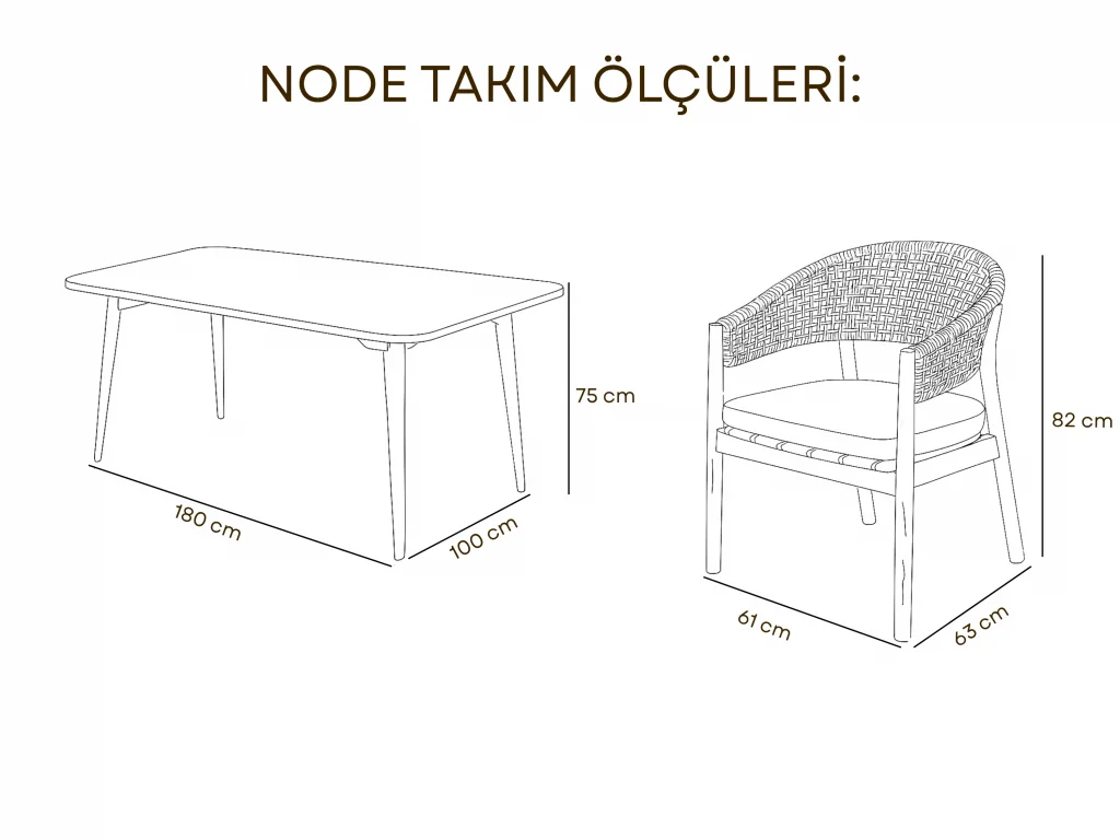 Teknik Ölçüler: | Parça | Genişlik (cm) | Derinlik (cm) | Yükseklik (cm) | | :--- | :--- | :--- | :--- | | Masa | 180 | 100 | 75 | | Sandalye | 60 | 70 | 84 |