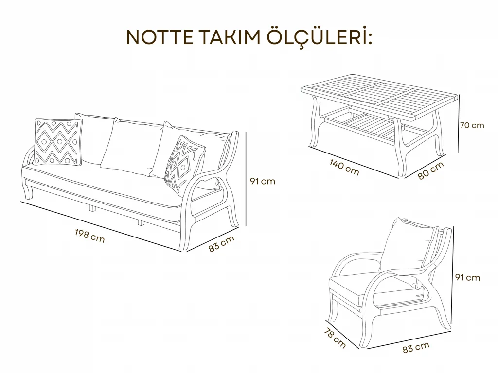 Modern tasarım anlayışıyla üretilen Notte Takım; estetik detayları, yüksek konfor seviyesi ve dayanıklı yapısıyla balkonlarınıza benzersiz bir hava katıyor.