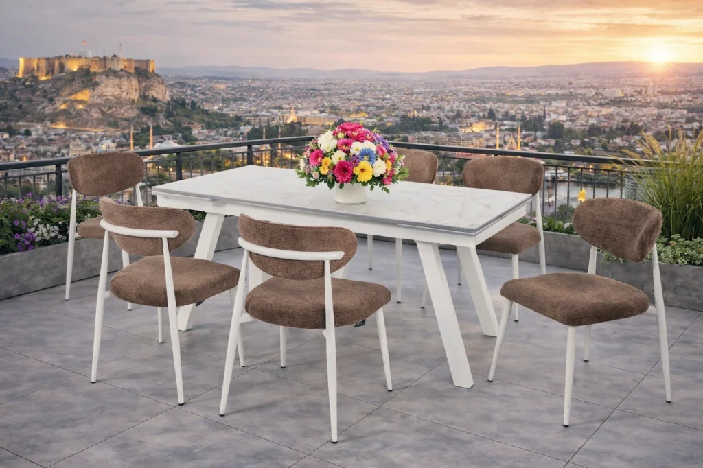Sağlam Metal İskelet: Hem masada hem de sandalyelerde kullanılan metal ayaklar, bütüne sağlamlık ve uzun ömür kazandırır.