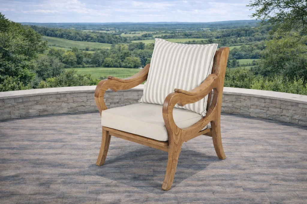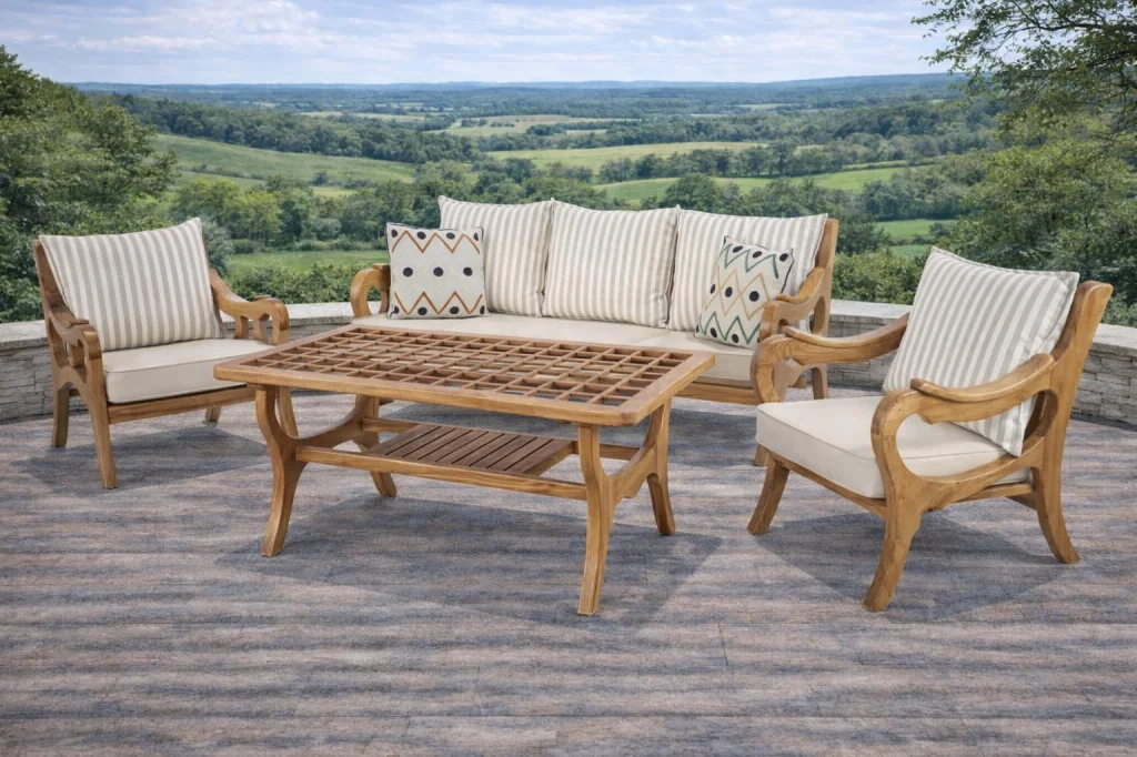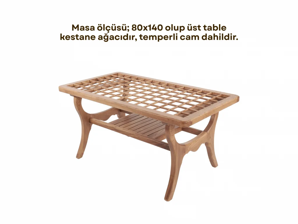Kestane Ağacı İskelet: Takımın ana malzemesi olan kestane ağacı, kendine özgü damar yapısı ve sağlamlığı ile dikkat çeker. Dış hava koşullarına yüksek direnç göstererek uzun yıllar dayanıklılığını korur ve doğal bir görünüm sunar.