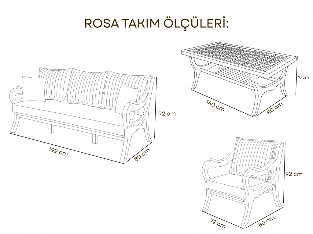 Teknik Ölçüler: | Parça | Genişlik (cm) | Derinlik (cm) | Yükseklik (cm) | | :--- | :--- | :--- | :--- | | Tekli Koltuk | 72 | 80 | 92 | | Üçlü Koltuk | 192 | 80 | 92 | | Masa | 140 | 80 | 70 |
