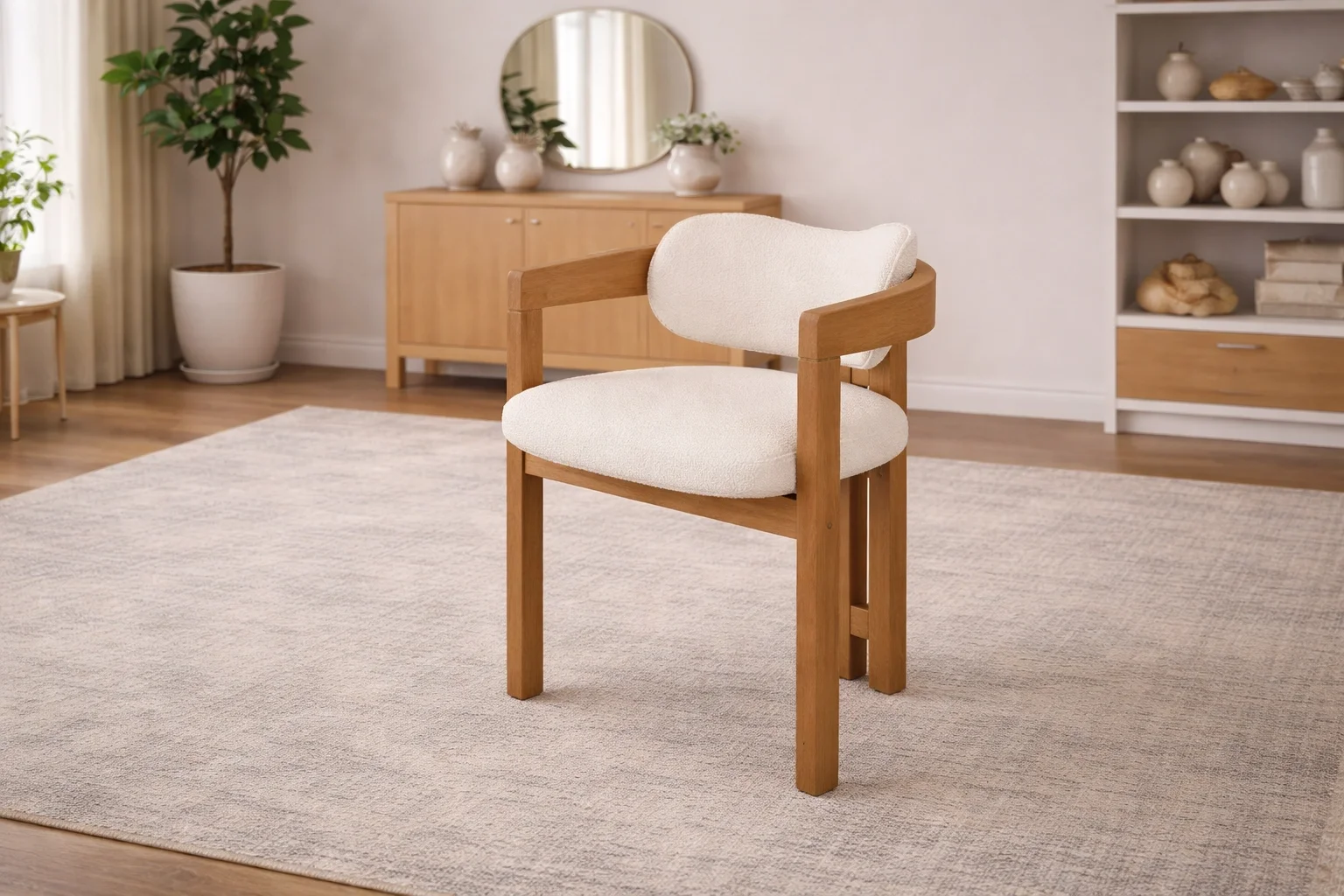 Karakteristik T Sandalye: Gövdeyle bütünleşen kolçak detayı sandalyeye özgün bir görünüm kazandırırken; geniş oturum ve sırt desteği yüksek konfor sağlar.