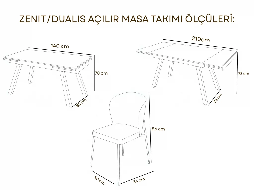 Zarif çizgileri ve fonksiyonel yapısıyla öne çıkan ZENIT / Dualis Açılır Masa Takımı, modern yaşam alanlarına şıklık ve kullanım kolaylığı kazandırır. Geniş aile yemekleri ya da misafir ağırlamaları için ideal olan bu set, açılır mekanizması sayesinde kalabalık anlarda ekstra alan yaratmanıza olanak tanır.